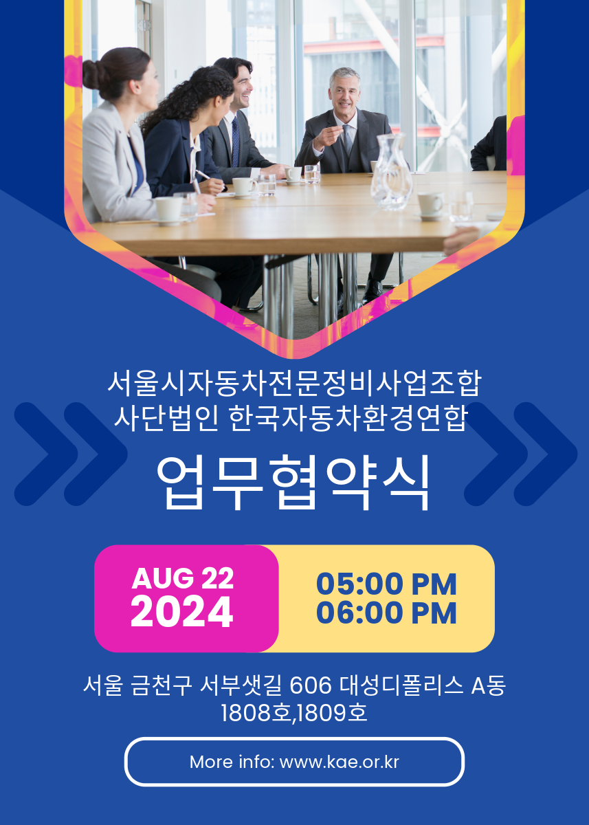 서울시자동차전문정비사업조합과 사단법인 한국자동차환경연합 업무협약식이 2024년 8월 22일 목요일 오후 5시서울 금천구 서부샛길 606 대성디폴리스 A동 1808호,1809호에서 열립니다.#서울시자동차전문정비사업조합 #사단법인한국자동차환경연합 #한국자동차환경연합 #친환경정비 #친환경정비이력제 #업무협약식 #mou #업무협약